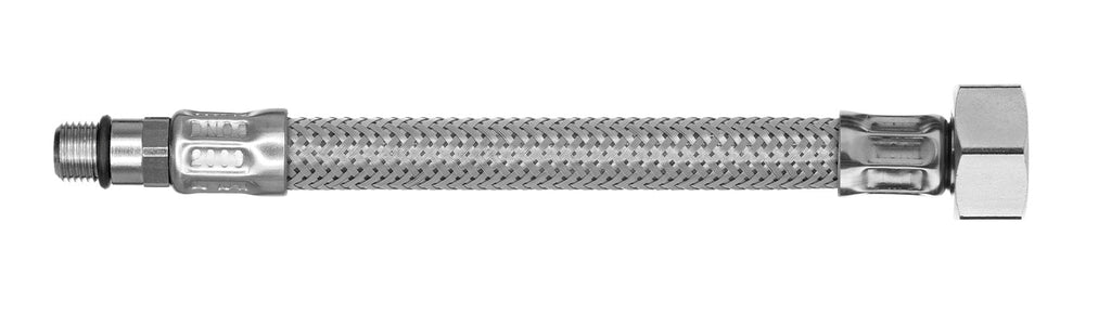Ce flexible de robinetterie est équipé d’un tube intérieur en EPDM de 8 mm de diamètre, entouré d’une tresse en acier inoxydable. Il dispose d’un raccord femelle 3/8" (12x17 mm) et d’un raccord mâle court M10x100, facilitant l’installation dans les espaces réduits.