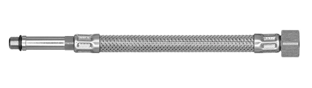 Ce flexible de robinetterie possède un tube intérieur en EPDM de 8 mm de diamètre, protégé par une tresse en acier inoxydable. Il est doté d’un raccord femelle 3/8" (12x17 mm) et d’un raccord mâle long M10x100. Il supporte une température maximale de +90 °C et une pression de 16 bars, assurant sa compatibilité avec la majorité des réseaux domestiques.